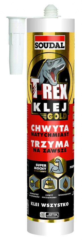 T-REX GOLD marki Soudal jest uniwersalnym klejem montażowym, który doskonale sprawdzi się podczas klejenia typowych materiałów budowlanych, wszelkiego rodzaju materiałów wykończeniowych i dekoracyjnych na ścianach podłogach i sufitach. Przeznaczony jest do elementów wykonanych z drewna, szkła, lustra, styropianu, metalu, PVC, gipsu, płyt g-k, stali nierdzewnej, stali ocynkowanej, kamienia sztucznego i naturalnego, betonu, cegły, korka, ceramiki, porcelany, wełny mineralnej i waty szklanej. Z powodzeniem możemy go zastosować również do awaryjnego klejenia materiałów dekarskich oraz do odpornego na wibracje i wilgoć mocowania elementów konstrukcyjnych. Klej ten jest bardzo łatwy w aplikacji, zdecydowanie usprawnia realizację prac montażowych oraz daje gwarancję trwałego efektu.