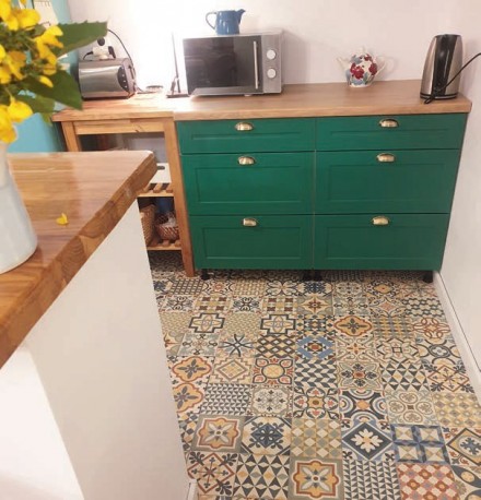 Problematyczne natomiast były stare okładziny. Ściana prostopadła do ciągu roboczego była aż do sufitu wyłożona płytkami „dziesiątkami” w kolorze beżowym, gdzieniegdzie urozmaiconymi dekorami z kwiatowym wzorem. Korzyścią zarówno z punktu widzenia finansowego, jak i organizacyjnego było ich pozostawienie. Zamiast je skuwać, pomalowano je na jasnoszary kolor – rozjaśniły w ten sposób i optycznie powiększyły niewielki aneks. Pomalowano też harmonijkowe drzwiczki do spiżarni. Na posadzce położono nowe płytki patchworkowe. Jako podłoże wykorzystano starą posadzkę z beżowej dość już podniszczonej terakoty.