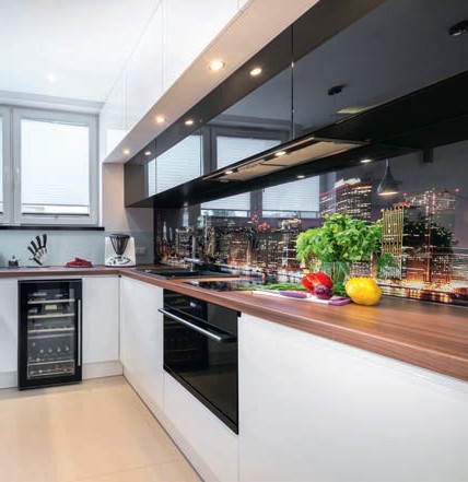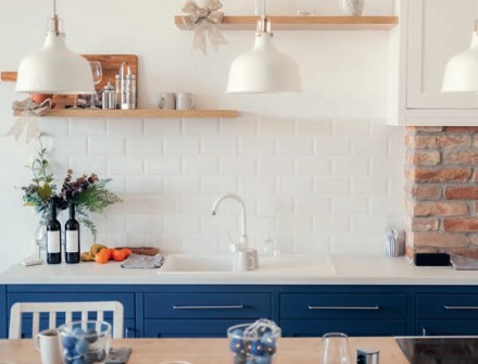 Jeśli zależy nam na stworzeniu w kuchni niebanalnej i kreatywnej przestrzeni, zdecydujmy się na wykończenie ściany farbami tablicową i magnetyczną. Farby tablicowe to najczęściej dyspersyjne wyroby lateksowe lub akrylowe, występują w szerokiej gamie kolorystycznej, mogą być matowe lub półmatowe. Powierzchnia pomalowana farbą tablicową jest odporna na wilgoć. Niestraszne jej wielokrotne zmywanie wodą, a także intensywne rysowanie kredą. Na tak wykończonej ścianie będziemy mogli robić listę zakupów, sprawdzi się też jako ściągawka z wypisanym ulubionym przepisem na potrawę, którą mają wykonać dzieci. Może też pełnić funkcję tablicy informacyjnej dotyczącej planu dnia czy zadań, które muszą wykonać członkowie rodziny. Farba magnetyczna to dyspersyjna farba podkładowa w kolorze szarym – najczęściej akrylowa, lateksowa lub alkidowa. Dzięki bardzo drobnym cząsteczkom żelaza (magnetytu żelazowego) przyciąga magnes. Na powierzchnię pomalowaną farbą magnetyczną można nanieść farbę w dowolnym kolorze, jednak warto zastosować farbę tablicową, co znacznie poszerzy jej możliwości aranżacyjne i funkcjonalne.